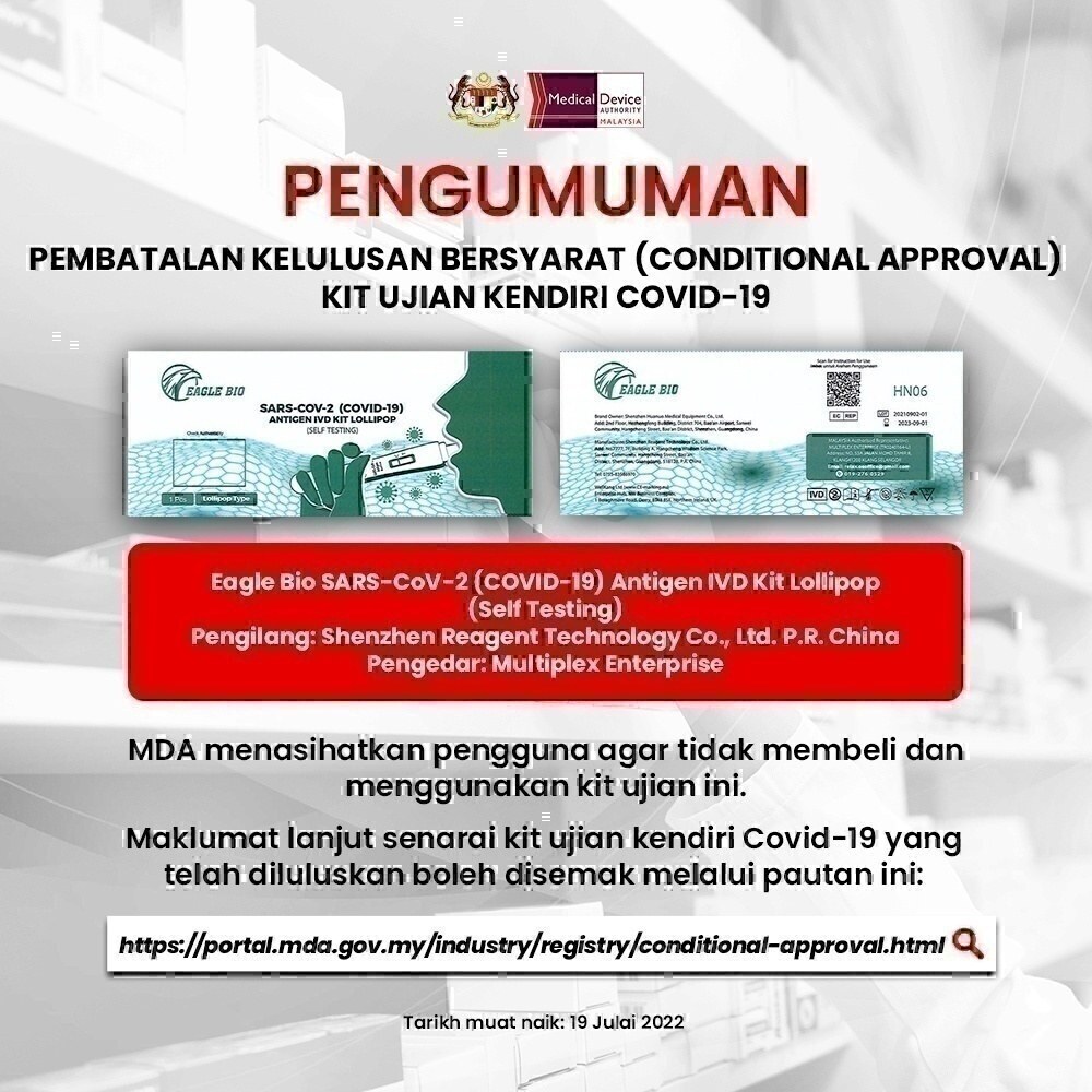 Pihak Berkuasa Peranti Perubatan (MDA) telah membatalkan kelulusan bersyarat bagi kit ujian kendiri Covid-19 seperti yang berikut: